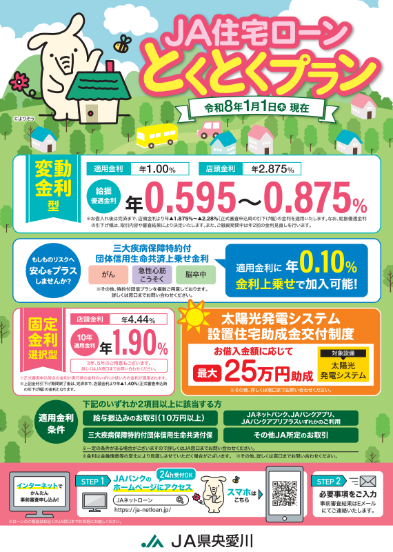 ・三大疾病保障付 ・長期継続入院保障付 ・9大疾病補償付 ・団体信用生命共済 ・がん保障特約付 三大疾病保障特約付 ・ワイド団体信用生命共済